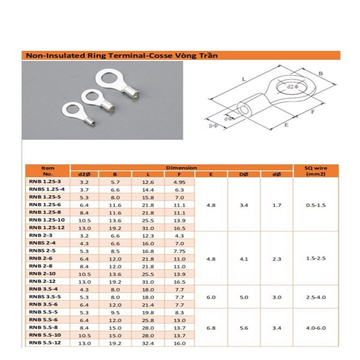 - RNB1.25-8: Lỗ bắt ốc 8MM, phù hợp với tiết diện dây từ 0.5-1.5MM